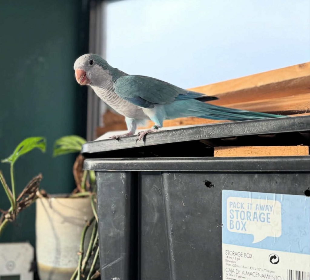 5 year old blue quaker parrot – Not DNA sexed but assumed male. Very chatty and LOVES to fly, will land on your head when comfortable but that is about as close as he will let you get as not comfortable with hands or being picked up – may tame down with lots of work as was originally a hand reared baby.